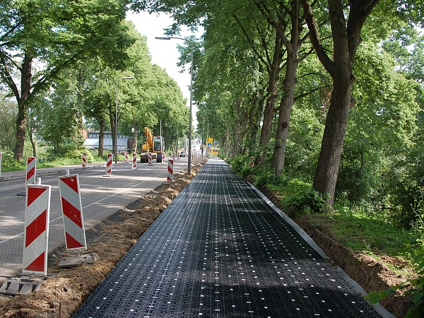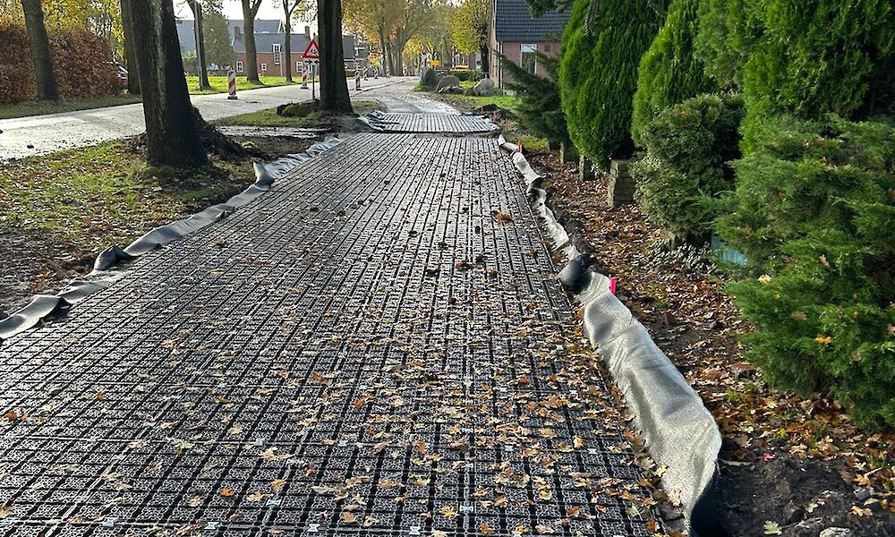 New Urban Standard heeft voor dit ontwerp het fietspad in Kropswolde aangepakt. Het asfalt is verwijderd waarna de Permavoid Sandwich met de 85S is aangebracht in plateaus. Hierop is na het plaatsen van de folie, ook granulaat verwerkt waarna de asfaltmachine de afwerklaag aan kon brengen. Heldergroen adviesgroep heeft toezicht gehouden om het boomtechnisch in goede banen te leiden.