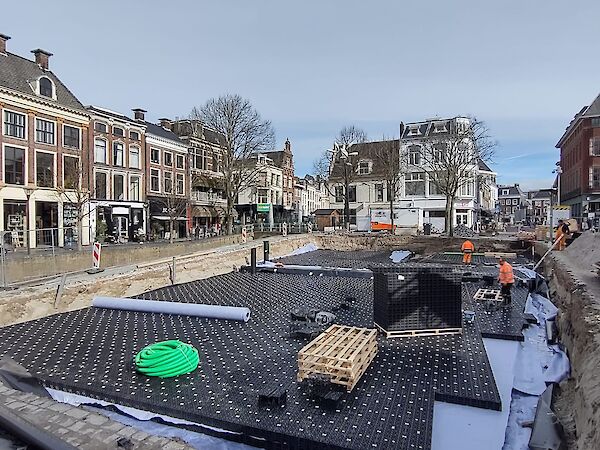 Op de groeiplaatsen word het Permavoid systeem aangebracht waarop de half verharding KoMex-BIO aangebracht wordt in 2 lagen: een onderlaag en de toplaag. Het water vanaf zowel de hergebruikte klinkers als wat op de halfverharding valt zakt door de halfverharding heen om zo de bodem en daarmee de wortels van de bomen te voeden met water.