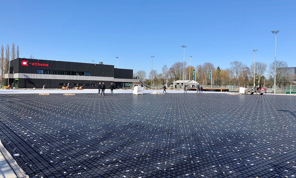 Door de Permavoid units in te sluiten met een waterdichte folie, beschermd door twee lagen geotextiel, wordt het gehele veldoppervlak een waterreservoir. Voor het hockeyveld bij HC Athena resulteert dat in een wateropslagcapaciteit van (6.500 x 85mm = 552.500 liter) 550m3.