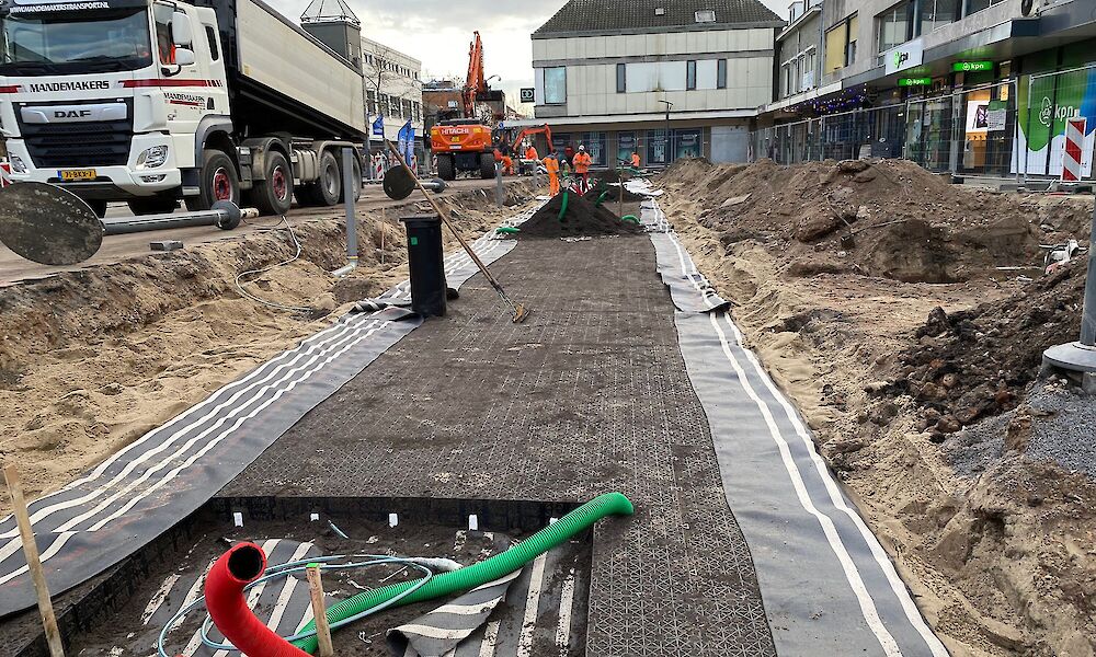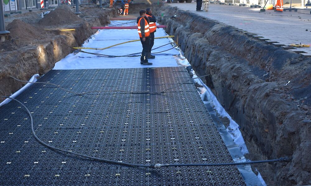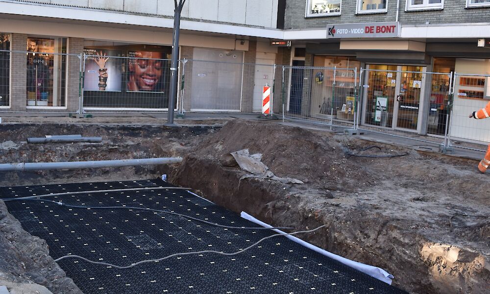 De wens om regenwater af te koppelen van het riool en meer diversiteit in planten aan te brengen hebben we opgelost door twee grote bakken van ruim 180 m2 te maken (in totaal 397 m2) van het Permavoid 150 systeem waar in totaal 60.000 liter water gebufferd kan worden. Met daarboven bomenzand wordt nog een extra 30.000 liter water gebufferd. Het Permavoid systeem functioneert hier als tweede maaiveld en drukverdelende laag. Daarnaast reguleert het systeem het grondwater zodat de voedingsgrond van de bomen niet te nat blijft. De groeiplaats wordt gevoed door de omliggende daken en vooral die van het stadhuis, het Slot (horeca), verschillende winkels en het museum zijn op het systeem aangesloten.