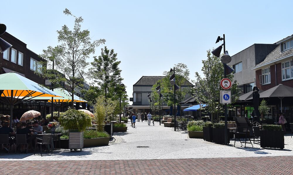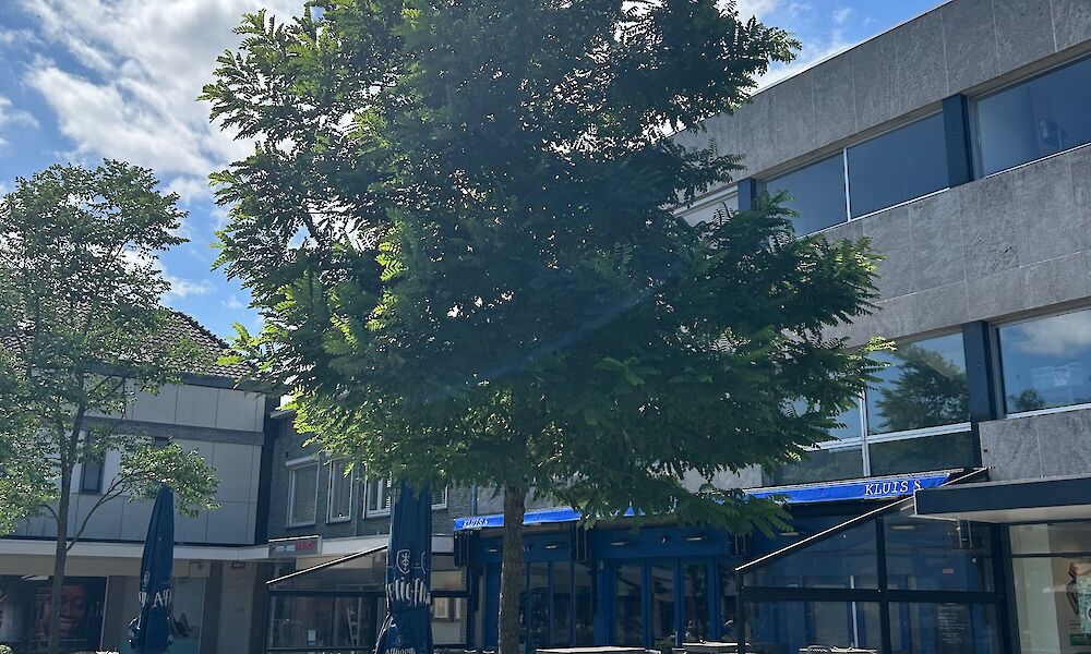 De bomen staan in een boombakbank midden op het horeca plein en maken een onderdeel uit van de invulling van de terrasmeubilair