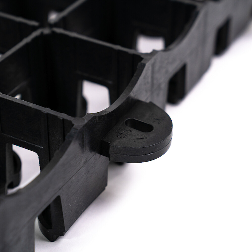 Flowblock bestaat uit 100% recycled PE-materiaal en is van Nederlands fabrikaat. De tegels zijn voorzien van een pen/gat-verbinding inclusief borgwig. Dit garandeert een zeer solide verbinding; met een klikverbinding is deze garantie niet te geven. De grote dragende voeten aan de onderzijde zorgen voor een goede drukverdeling. Hierdoor ontstaat één dragend geheel en kan men zelfs zonder kantopsluiting werken. De aanwezige drainagepoorten zorgen voor een goede waterhuishouding.